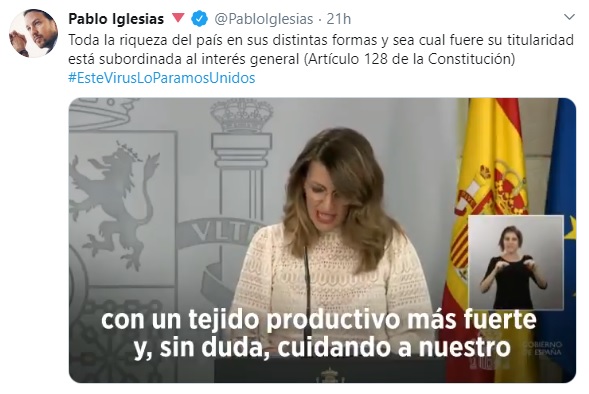 Mi amigo Toni Carro, uno de los comunistas más cariñosos y nobles que conozco, aprovecha para recordarme cuando puede que la propiedad individual no debe ser como la entendemos los liberales y, si ha de existir, debe ser siempre en beneficio del bien común. Ese creo que es el quid de la cuestión: Pablo interpreta que es el momento de poner en práctica su ideología comunista y redistribuir toda la riqueza del país de acuerdo con lo que él considera que es el «interés general», dando por hecho que el Estado conoce perfectamente en qué consiste eso. Yolanda lo deja caer en su exposición: «de esta crisis vamos a salir apoyando y con más derechos a los trabajadores, con un tejido productivo más fuerte y, sin duda, cuidando a nuestro pueblo.» El énfasis está en los trabajadores y el pueblo, que siempre los mencionan en sus discursos para justificarse, y con «tejido productivo» más fuerte se refiere, obviamente, a otro tipo de tejido productivo, pues el actual, el del libre mercado, está siendo destruido. Debemos entender que imagina un tejido productivo basado en la iniciativa pública y no en la empresa privada: los medios de producción en manos del Estado.
