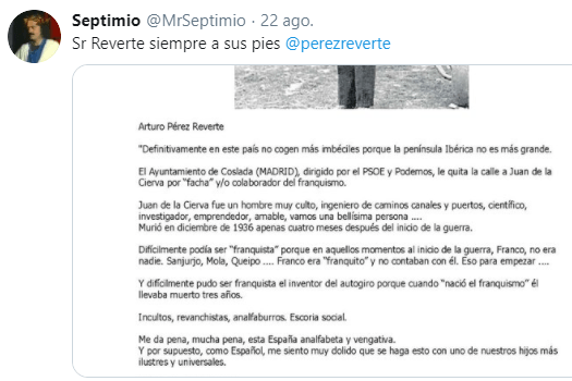 Sirve de ejemplo infame un reciente artículo de la Cope, que abusa de Arturo Pérez-Reverte para sus intereses, sin importarle la verdad de lo que publican ni lo que puedan manchar el prestigio del escritor. Titulan sin escrúpulos: «El texto contra PSOE y Podemos de Pérez-Reverte… que ni siquiera es suyo: ‘Se lo agradezco igual’.» La imagen que utilizo aquí es en la que se apoya La Cope, por si fuera poco el titular. Se trata de un texto que circula por las redes con el nombre de Arturo, el cual tilda al Gobierno de incultos, revanchistas, analfaburros, imbéciles y otros piropos semejantes. Alguien publicó este tweet: