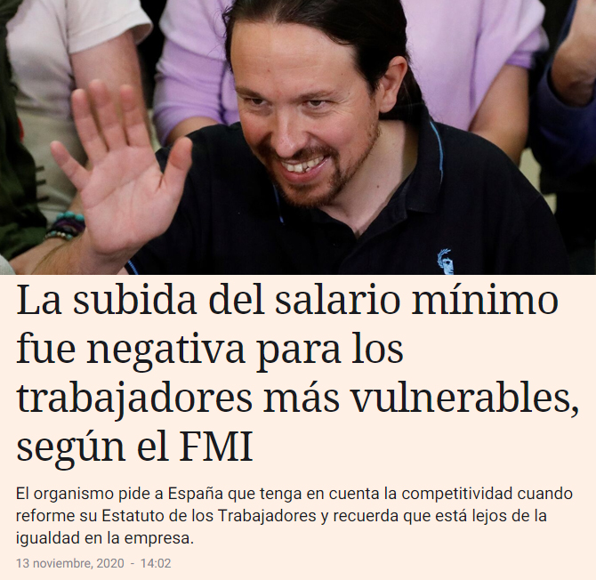 La subida del salario mínimo ha sido un caballo de batalla recurrente de la izquierda en todas las épocas y continentes. Su discurso se apoya en la justicia social y la atención a los más vulnerables. Sin embargo, el FMI se pronuncia en contra de esa idea, explicando que la subida ha perjudicado precisamente a quienes decía proteger. Lo publica María Vega en El Español. Parece un contrasentido. ¿Será eso posible? No solo es posible, sino que también es un hecho recurrente, en todas las épocas y continentes: subir el salario perjudica a los más vulnerables. Veamos por qué.