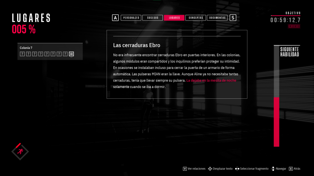 Imagina que Aline sufre un espasmo y se desmaya. Ella sabe por qué, lo ha visto muchas veces en otras personas, demasiadas, pero tú todavía no lo sabes. Sin embargo, puedes ver lo mismo que ella ve mientras yace: figuras sombrías, tormento, montones de carne que crujen y la quieren aplastar, ansiedad, grutas por las que resbala, tan siniestras como intestinos gigantes, suelos que se desmoronan bajo sus pies, miedo, ruido y asombrosos parecidos con personas a las que amaba. Siempre vuelve de ese espacio liminal, tan desconcertada como tú, con el reloj menguando inexorable. Es el síntoma inequívoco de que algo le pasa, el funesto tic tac de la muerte que corroe su ya maltrecha voluntad. Aún no sabes lo que es, pero ahí están las claves para descubrirlo junto a ella. Por qué no hay nadie, te preguntarás. ¿Estarán todos muertos? Pero… tampoco hay cadáveres en la Colonia 7. Así se llama el complejo, lo ves en un cartel enorme que ilumina una pasarela, desde la que puedes observar un sinfín de plataformas preñadas de apartamentos como una especie de colmena humana, pero vacía. ¿Por qué está allí Aline? ¿Desde cuándo? Ella, por desgracia, ya tiene esas respuestas, pero tú aún no lo has averiguado. Tampoco sabes qué es la Colonia 7, dónde está, ni si hay alguien que la retenga allí. Solo sabes que hay algo que mantiene su interés vivo, algo que la mueve a escapar antes de que el tiempo se agote, pero ni siquiera sabes a dónde quiere escapar, ni de qué. Aline sabe que no sobrevivirá al reloj, si alguna vez pensó que nunca llegaría su momento, ahora sabe que es inevitable. Pero no sabe por qué. Sin embargo, tú, que gobiernas sus pasos, ni tan siquiera sabes quién es Aline.